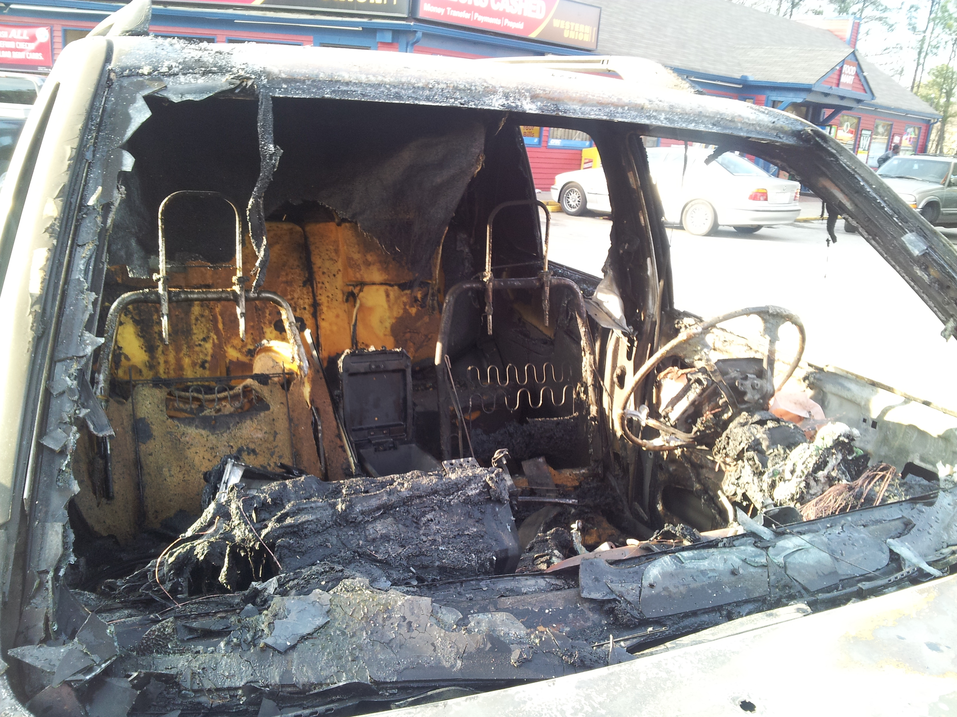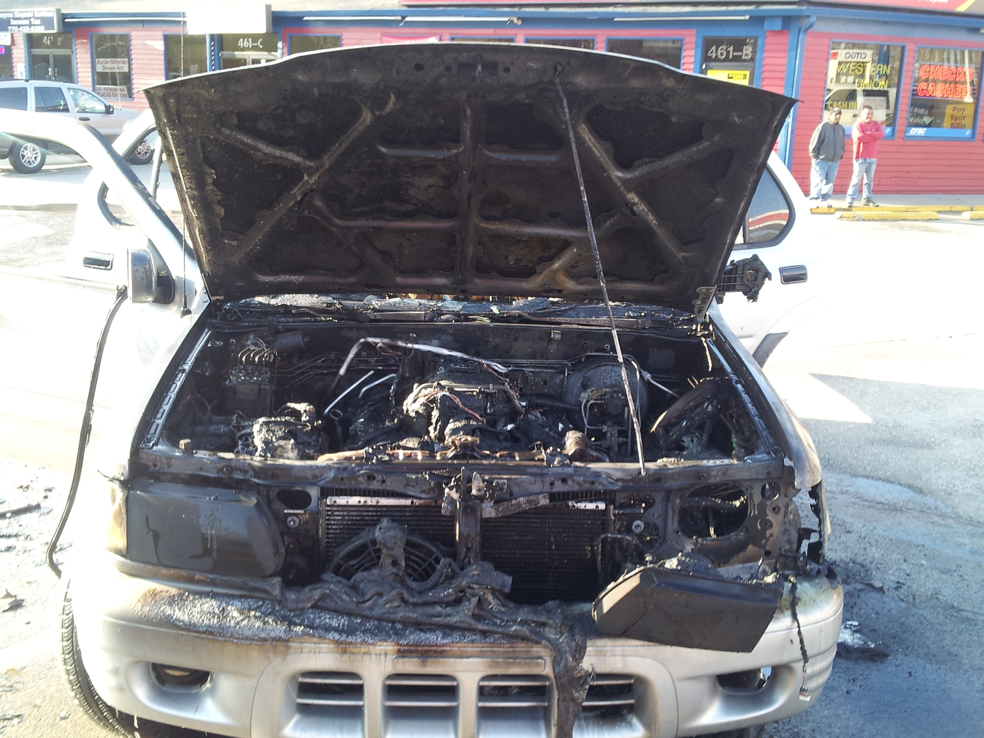 One of the merchants of a nearby store called 911 for me and the fire department was there in a few short minutes. They hosed down my SUV and it was no longer recognizable. Fortunately, neither I nor anyone else was injured as a result of the fire (I was the only one in my SUV). A tow truck came and took what remained of my SUV to their lot and I spoke with the fire chief about what I need to do in order to file a claim with my insurance company.